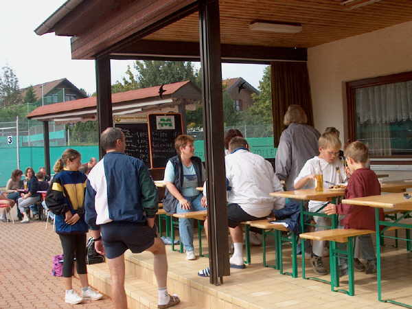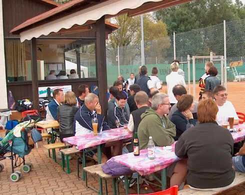 Überdachte Terrasse des Clubhauses mit erstklassiger Aussicht auf die Hauptplätze 1 und 2, ideal zum Verfolgen der Verbandsspiele und Mannschaftstrainings und zum gemütlichen Beisammensein, Getränkebewirtung abends |